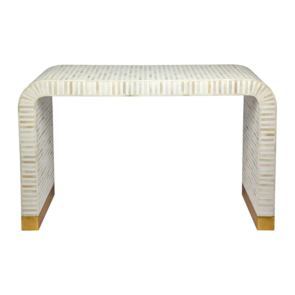 A striking artisan piece, the Amara bone inlay console table in natural is truly breathtaking. Each tile is meticulously hand cut and placed by skilled artisans to form a striking bone and resin stripe surface. The distinctly curved profile of the Amara works in perfect synergy with its brass clad base, further elevating this quality piece with stunning detail and a hint of glamour. A magnificent statement in any bedroom, entry or living area, the Amara bone inlay console table is also available in grey or black injecting modern charisma to interiors with its sophisticated design.