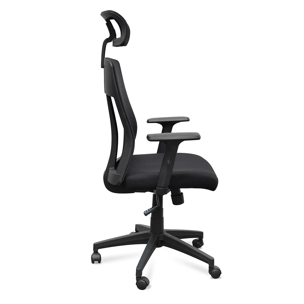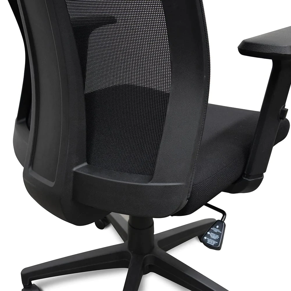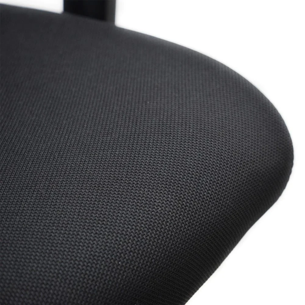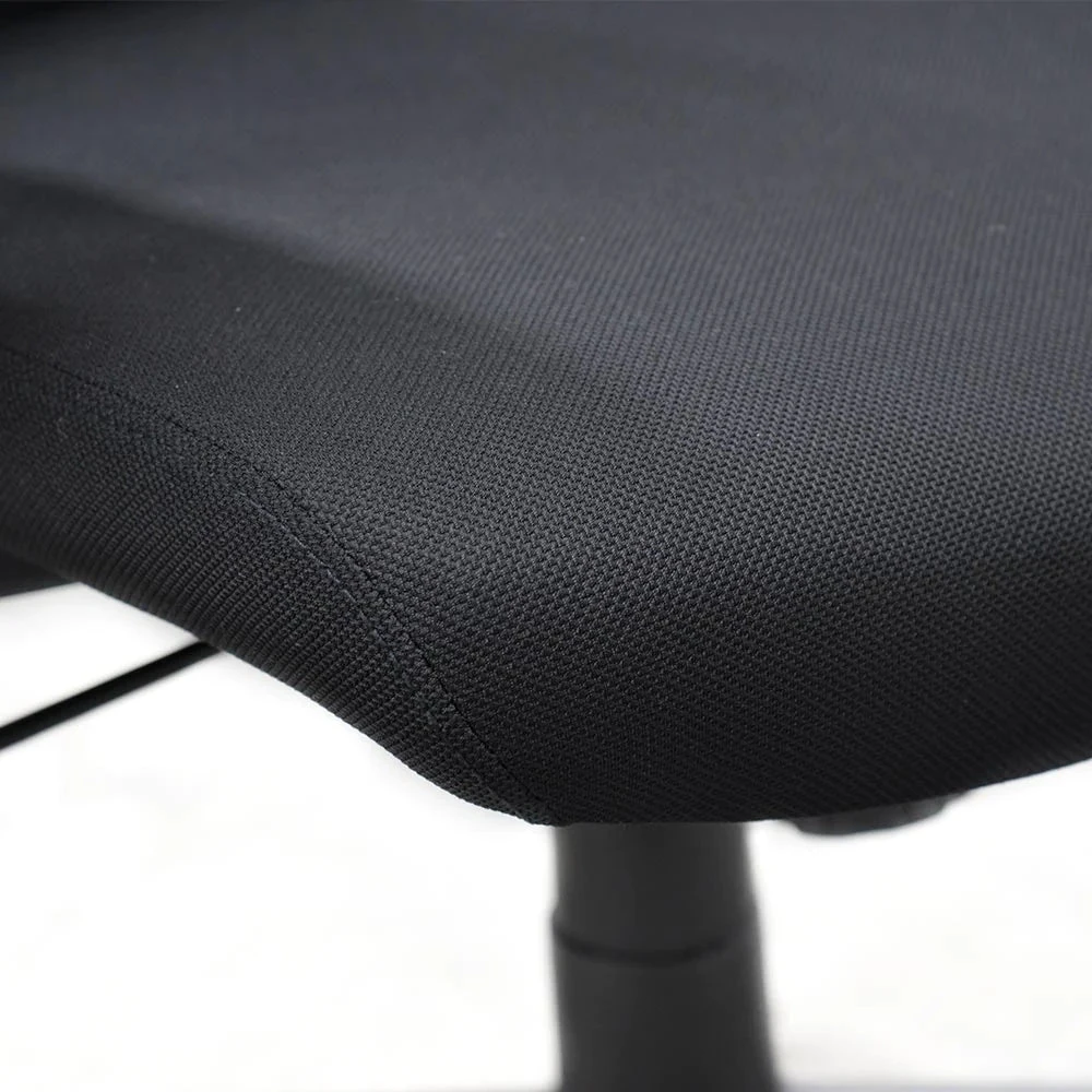 - Cushioned seat upholstered in black fabric to endure everyday use