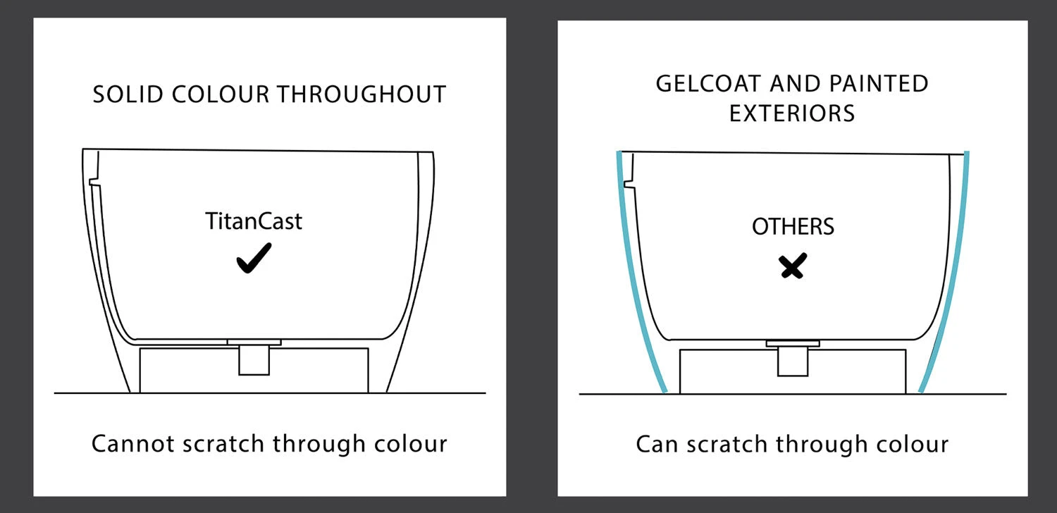 TitanCast Solid Surface Baths are unparalleled in quality, performance, durability and beauty. They are non-porous, hygienic, stain and chemical resistant and a repairable material. The TitanCast baths are solid throughout, scratches can be buffed out during the bath’s lifetime, furthermore, the white is crafted to match high-quality ceramics creating a cohesive look in our bathroom.