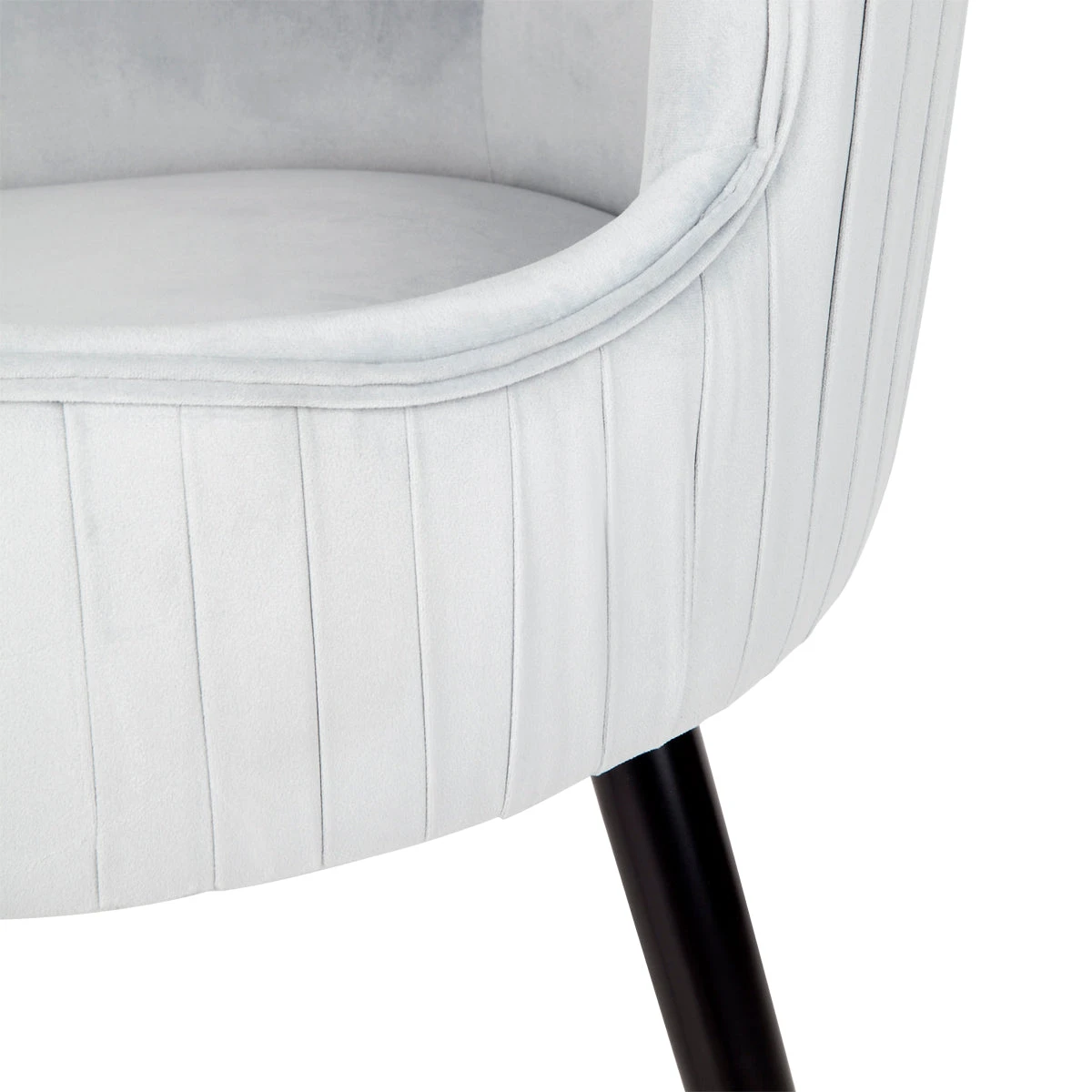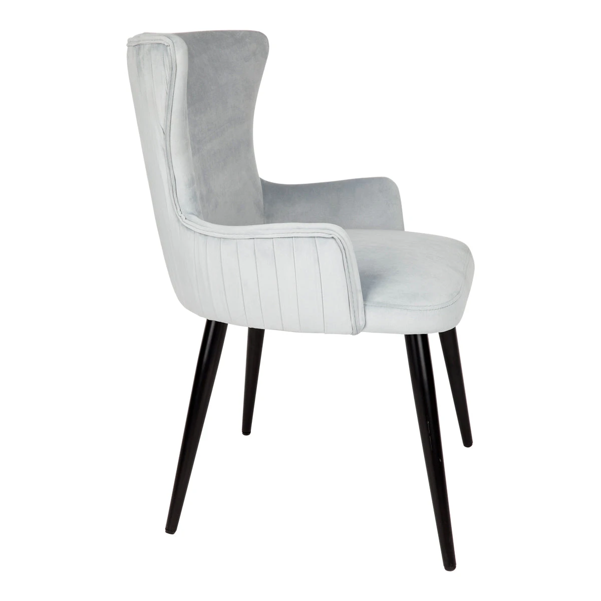 A striking addition to any dining space, the Dorsett dining chair is upholstered in a delicious cloud blue polyester velvet with slender black metal legs. Designed with impeccable attention to detail, the pleated back and sides and clean mid-century curves offer an exceptionally stylish profile when viewed from any angle. A gorgeous addition to any interior, Dorsett would be equally suited for use as an accent chair in a living, bedroom, or office setting. The Dorsett dining chair is also available in black and taupe polyester velvet. Packaged as a Set of 2 Chairs.