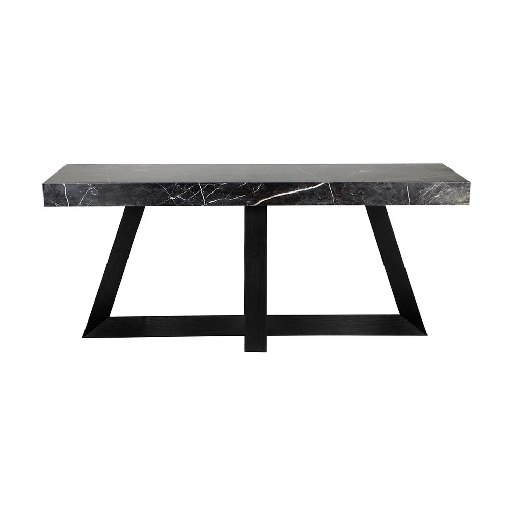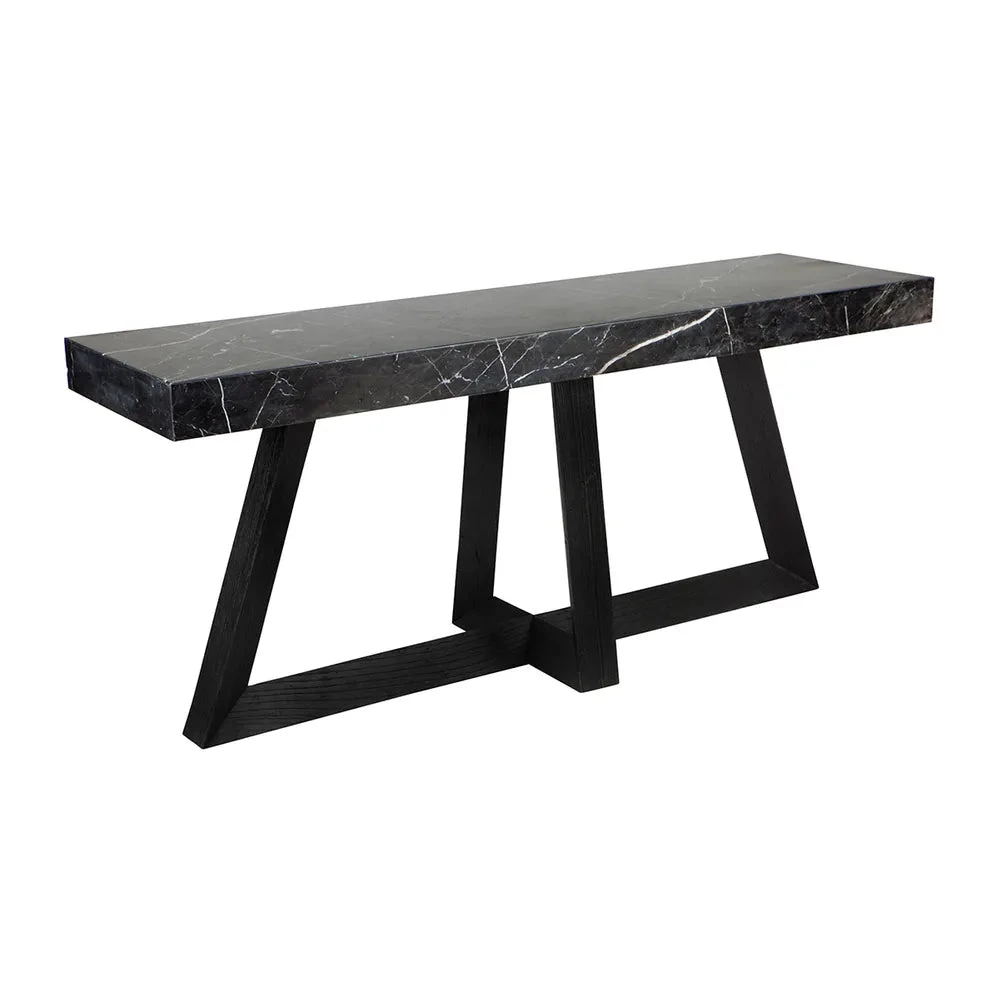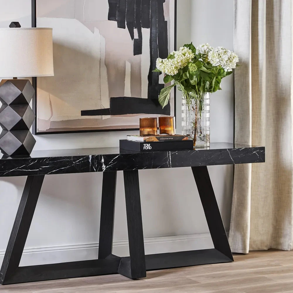 The Ebony black console table exudes classicism in a new form with its complimentary contrast of rich, smooth marble and distinctive geometric base, handcrafted in solid reclaimed elm wood. For lovers of all things bold, the striking black finishes make the Ebony console table an edgy statement for modern interiors.
