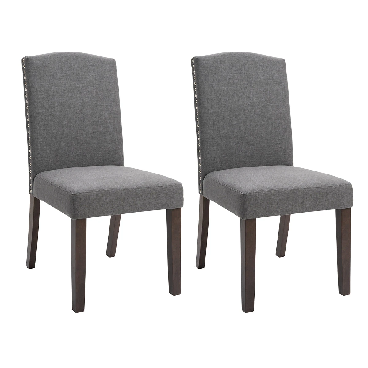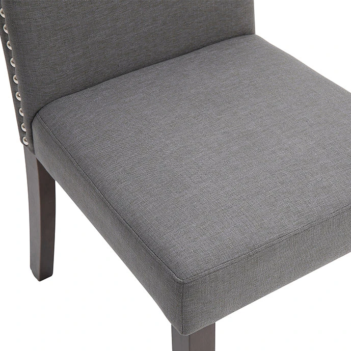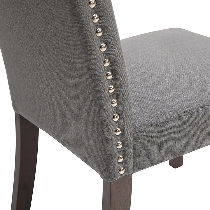 Classic looking is this Lethbridge Dining chair, with maximum comfort. Featuring a Light Grey linen look fabric with silver studs on the back and side. The Lethbridge would suit the Manhattan Apartment, Hamptons & French Country Styles. Antique wood coloured straight legs. The Lethbridge is ready to assemble furniture. Packaged as a Set of 2 Chairs.
