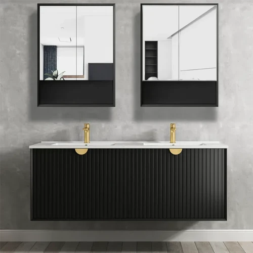 Besides your bed, your bathroom vanity/shaving cabinet is usually the first piece of furniture you interact with each morning. It kickstarts your day so if it’s unappealing to say the least it can make bringing your A game for the day ahead a little more challenging. Also sometimes the biggest obstacle holding your bathroom back is the way space is leveraged. Introducing our Marlo Shaving Cabinet- looks good by itself; looks better when paired with its matching vanity. Thanks to the size options it’s available in (600mm, 750mm, 900mm & 1200mm), it can make even the smallest bathrooms feel open and airy. Because it’s wall mounted it also maximises floor space. If you want your bathroom to have depth and style, this is what a happy life choice is going to look like for you- a wall mounted two door cabinet crafted with moisture resistant plywood with a luxurious matte black finish.