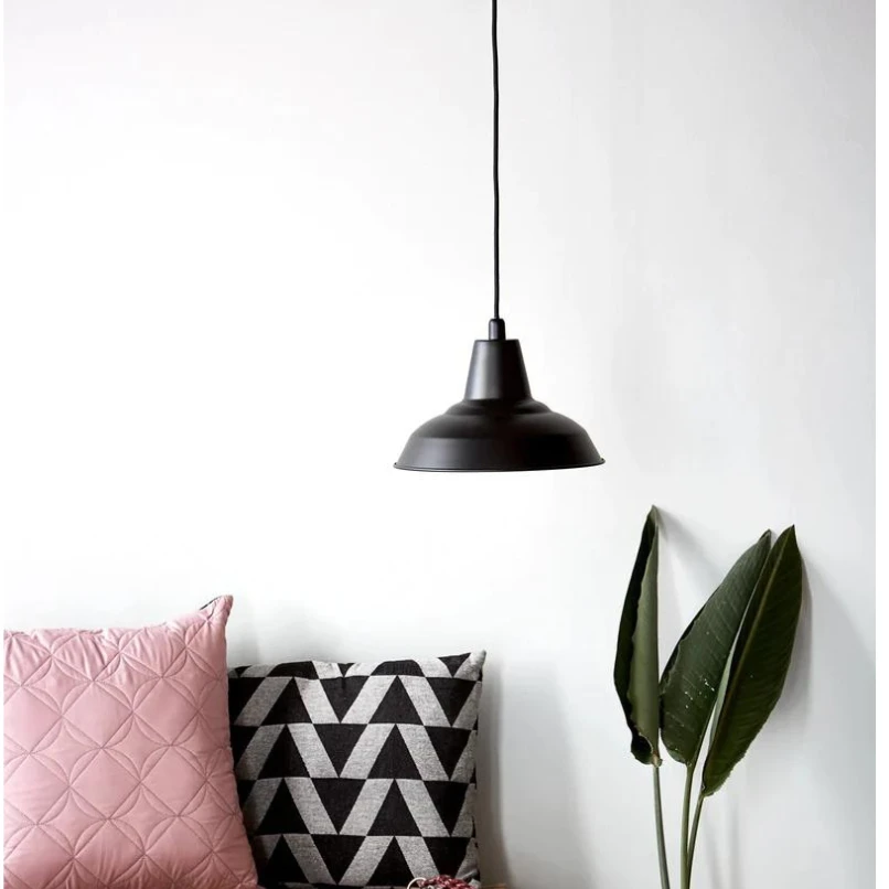 Lyne is a classic and stylish pendant light collection in an industrial design, with black lacquered metal shades and black fabric cords. The light is ideal for the kitchen or dining table. Light bulb not included.