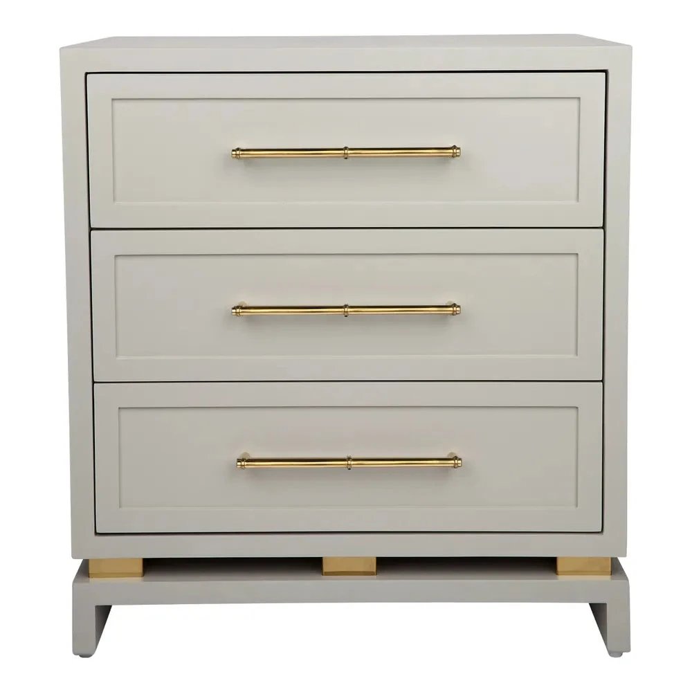 Timelessly elegant, the Pearl bedside table large complete with three drawers, the top drawer includes drawer dividers which is the perfect organisation solution. A warm grey satin finish is complimented with stunning polished gold bamboo style handles. The ultimate bedroom luxury.
