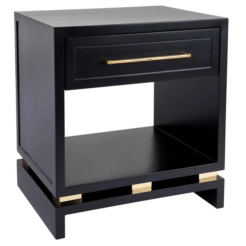 Smaller in scale without compromising function, the timelessly elegant Pearl bedside table small is a refined version of its bigger sister. With a wide tabletop, roomy nook and top drawer making this a smart storage option for smaller sophisticated spaces. A striking black satin finish is complimented with stunning polished gold bamboo style handles.