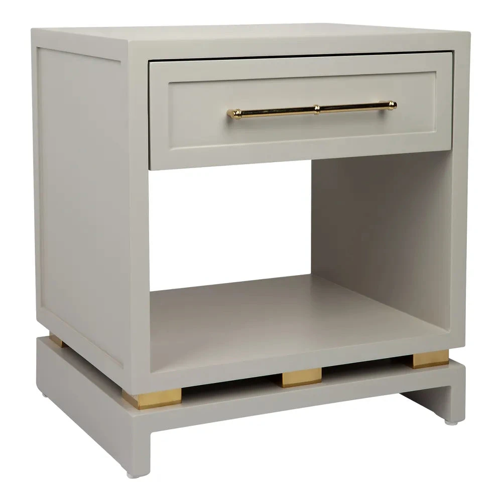Smaller in scale without compromising function, the timelessly elegant Pearl bedside table small is a refined version of its bigger sister. With a wide tabletop, roomy nook and top drawer making this a smart storage option for smaller sophisticated spaces. A warm grey satin finish is complimented with stunning polished gold bamboo style handles.