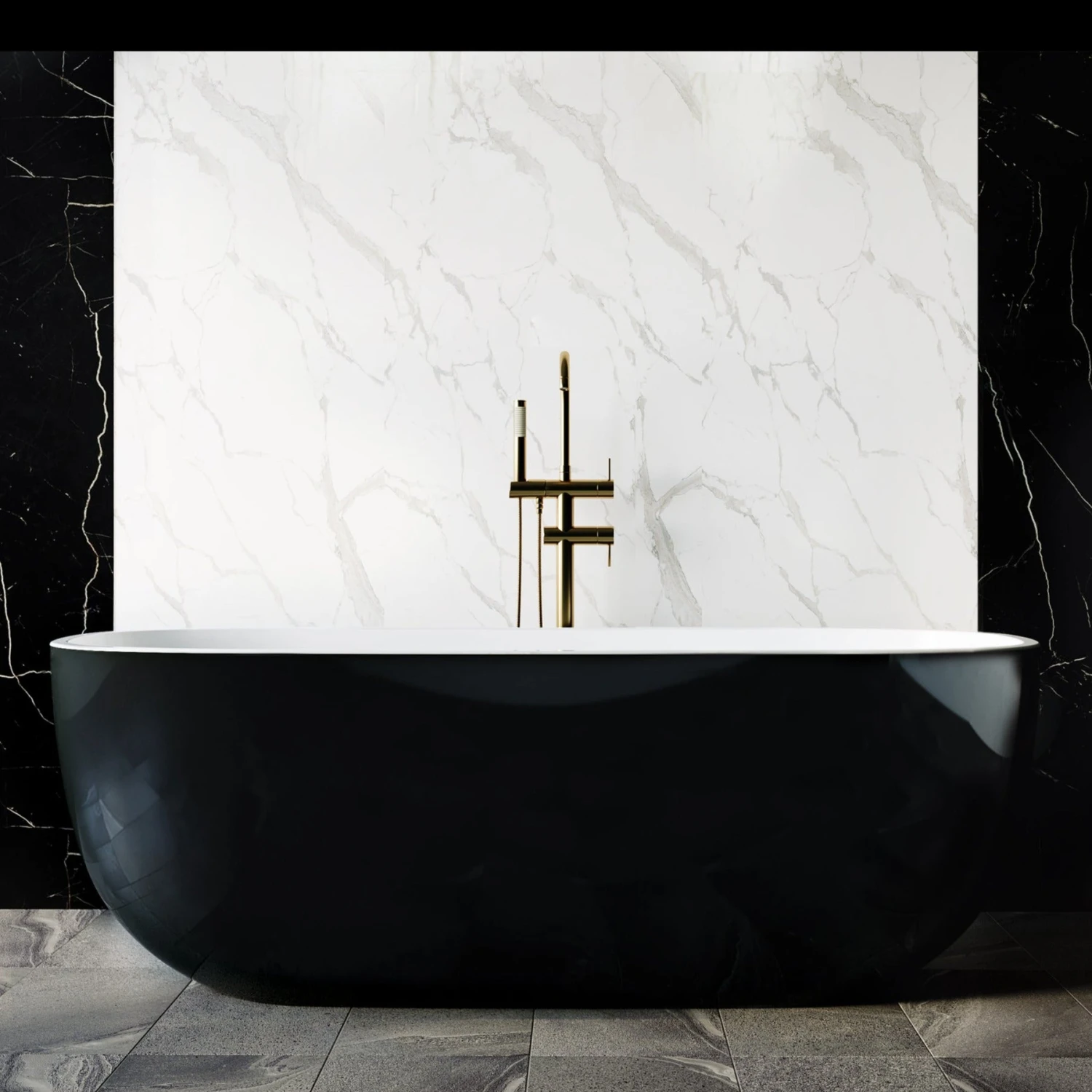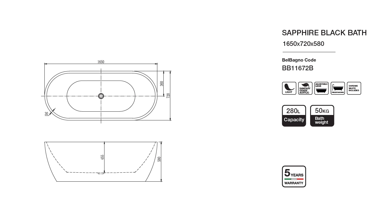 Sapphire Black Bathtub is 100% high gloss pure acrylic. Upmarket and contemporary designer style. High-quality fabrication. Durable materials. Add some style to your bathroom! BelBagno acrylic baths have excellent thermal properties, they retain heat and are warm to the touch.